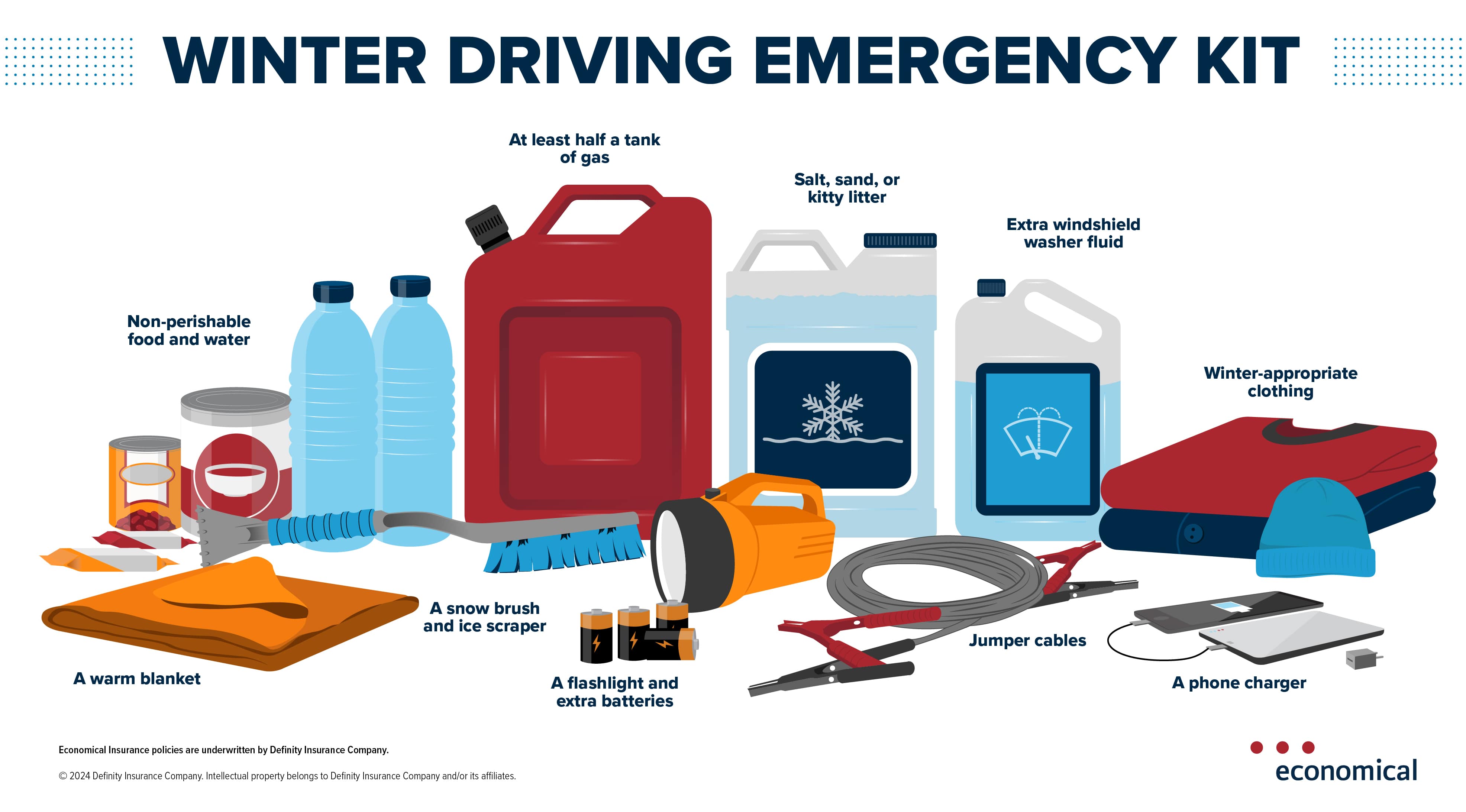 Canadian weather can be unpredictable, especially in the winter — and it can really throw you for a loop when you’re out on the road. Even when you’ve done your part by installing a set of quality winter tires and driving with extra care in the winter months, a snow-covered street can have a mind of its own. Stay safe and warm by keeping these 10 items in your car all season long: